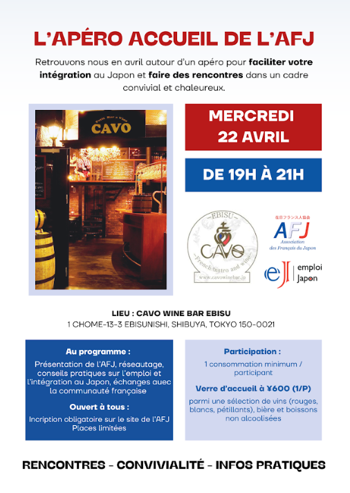 19h30 – PrĂ©sentation de l'AFJ et conseils pratiques (emploi, vie au Japon).